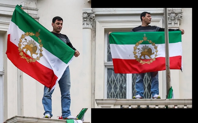 லண்டனில் உள்ள ஈரான் தூதரகத்திற்கு வெளியே நடந்த போராட்டம் உலகையே அதிர வைத்துள்ளது. ஆவேசமடைந்த ஈரான் போராட்டக்காரர் ஒருவர், தூதரகத்தின் பால்கனியில் ஏறி அங்கிருந்த ஈரான் நாட்டின் அதிகாரப்பூர்வக் கொடியைக் கிழித்து எறிந்தார். அதற்குப் பதிலாக, 1979 புரட்சிக்கு முன்பு பயன்பாட்டில் இருந்த, மன்னராட்சிக் காலத்து ‘Lion and Sun‘ கொடியை அங்கே பறக்கவிட்டார்.